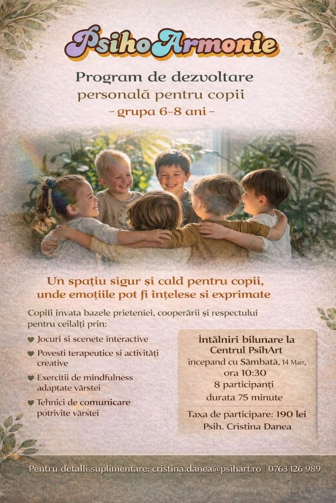 Pentru detalii suplimentare: cristina.danea@psihart.ro / 0763126989
